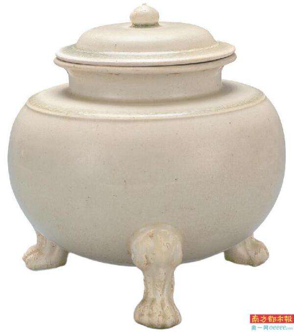 ▲巩县窑白瓷三兽足盖罐,唐代。