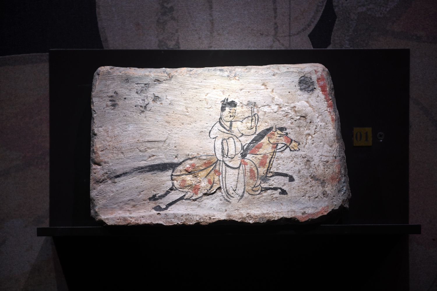 它的“不一般”,首先在于其“极简却传神”的艺术风格。该砖的画面以赭石色为底,墨线寥寥,却生动勾勒出一位策马疾驰的驿使:头戴魏晋帻帽,身着右衽短衫,左手控缰,右手举着文书。而骏马则四蹄腾空,动态感十足,一种风驰电掣的紧迫感似从画中扑面而来。更耐人寻味的是,画师刻意省略了驿使的嘴巴:这一“残缺”设计,并非疏忽,而是古人智慧的体现,象征着邮驿制度中“守口如瓶”的保密原则,使其成为中国古代信息保密文化的生动见证。