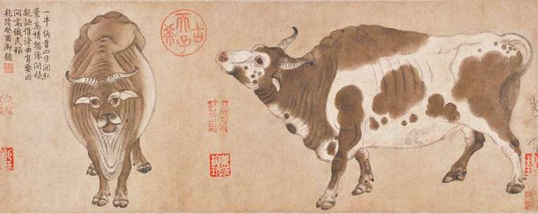 “一牛络首四牛闲,弘景高情想像间。舐龁讵惟夸曲肖,要因问喘识民艰。”乾隆十八年(1753年),乾隆皇帝在唐代韩滉名画《五牛图》的画心上题下这首诗,表达出与元代著名书画家赵孟頫的不同意见。