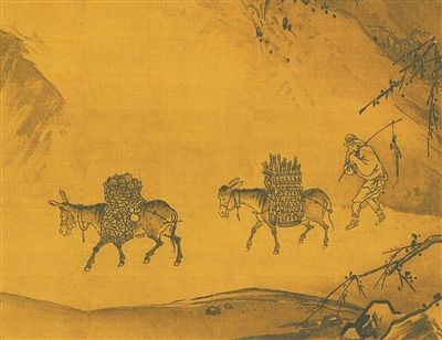 ▲《晓雪山行图》中驮炭的驴子(南宋 马远)。(作者供《北京青年报》)