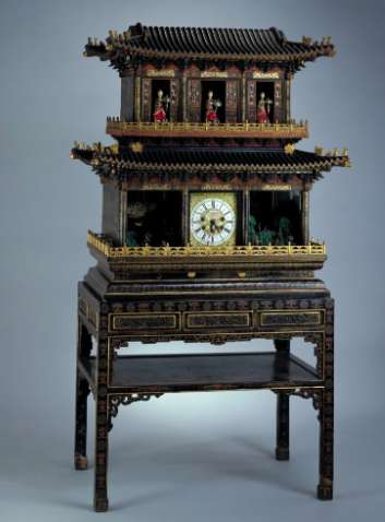 ▲黑漆彩绘楼阁群仙祝寿钟。乾隆年间,造办处荟集了一批西洋钟表匠和机械师,此钟即可体现当时水平。