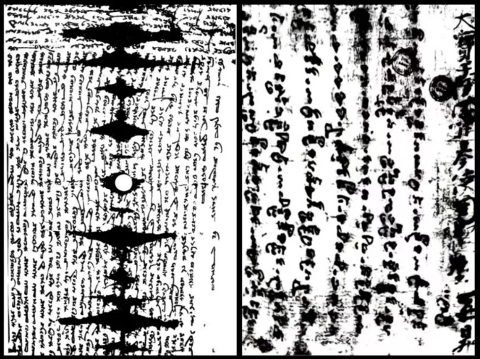 ▲敦煌遗书中的回鹘文写本残卷(左)和古藏文写卷(右)。(图片来源:胡同庆、罗华庆著《解密敦煌》)