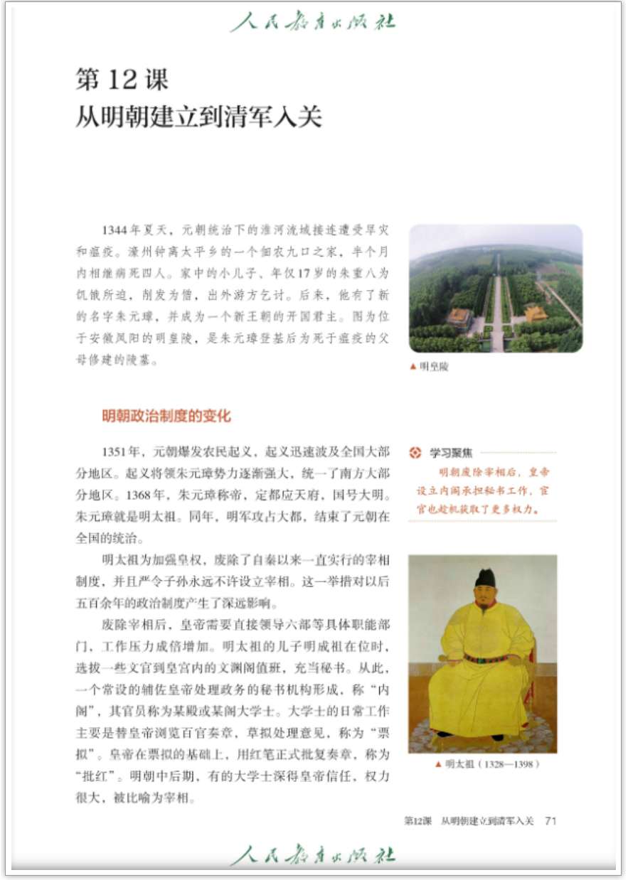 2019年高中《中外历史纲要(上)》里,朱元璋就已经摆脱“鞋拔子脸”,而最新的初中七下教材也同步更新。现在翻开新版课本,迎面而来的朱元璋是个面容丰满、神态沉稳、五官端整的皇帝画像,区别于以往那张令人印象过深的“麻子长脸”。