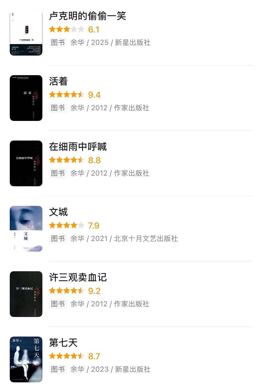▲余华几部长篇的豆瓣评分