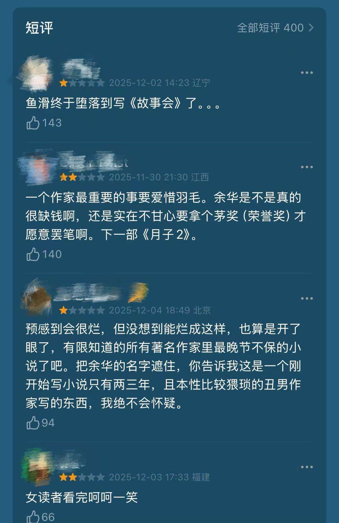 ▲余华新书豆瓣高赞评论节选