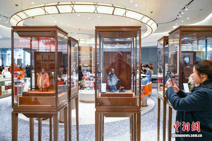 ▲11月28日,天津首家市内免税店,顾客在“泥人张”彩塑展示柜前打卡拍照。(图片来自中新社 佟郁 摄)