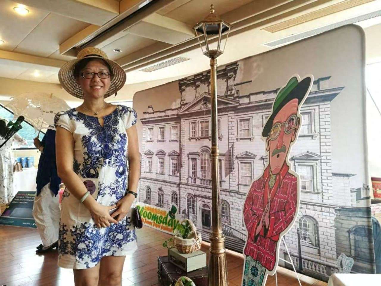 ▲戴从容现为南京大学全球人文研究院教授,图为她在上海的布鲁姆日活动上与作家詹姆斯·乔伊斯的画像合影。受访者供图
