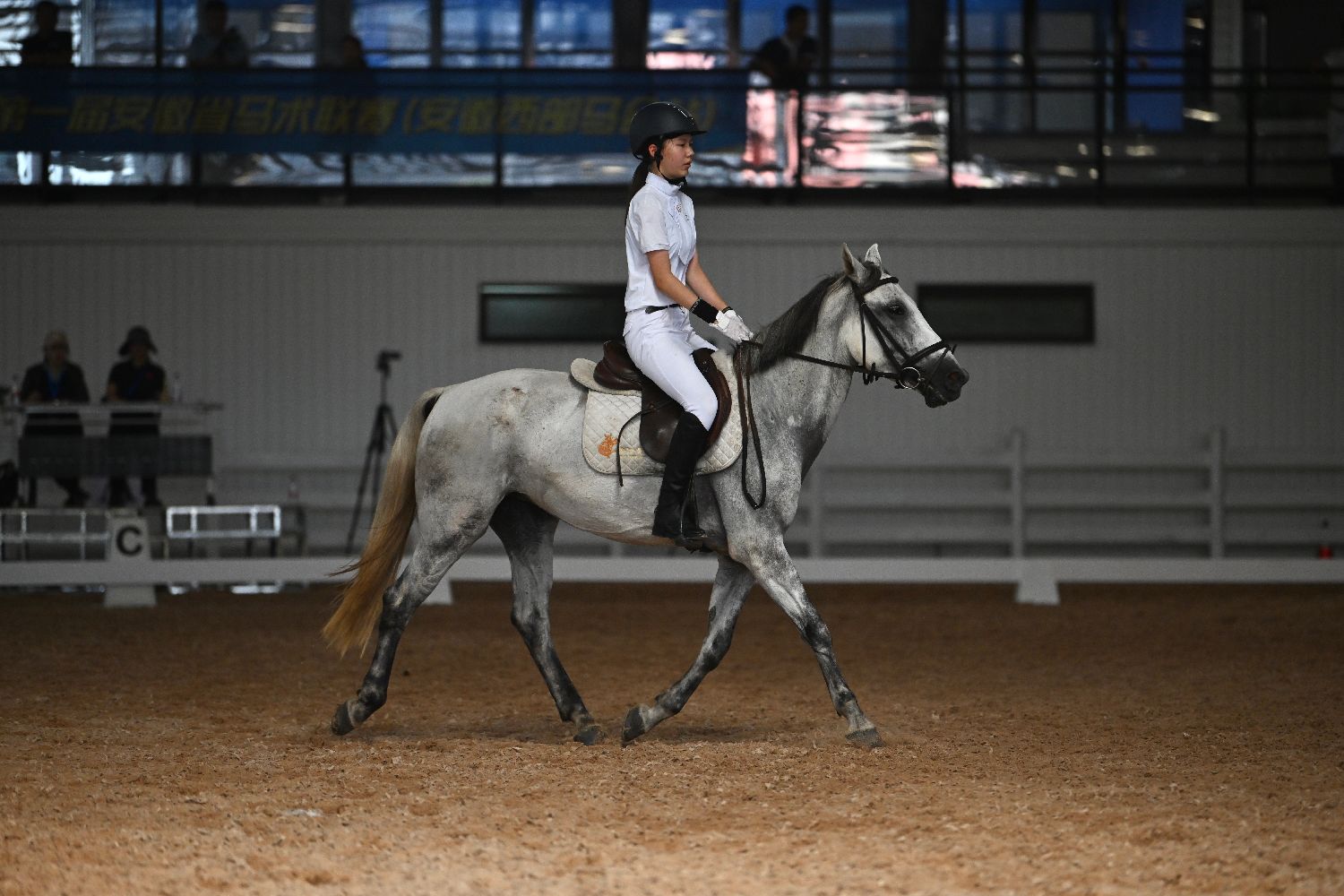 ▲8月25日,第一届安徽省马术联赛(安徽西部马会站)在合肥开赛。图为参赛选手和马匹进行盛装舞步比赛。(图片来自中新社)