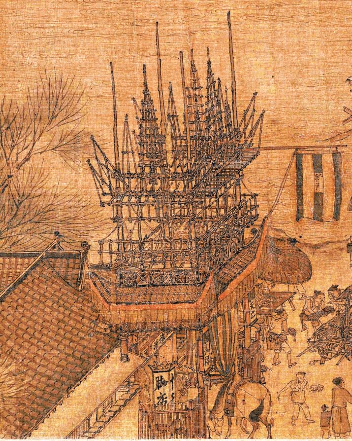 ▲宋代张择端《清明上河图》中“十千脚店”的彩楼欢门。(图片来自《北京晚报》)
