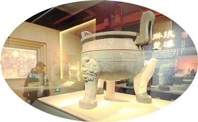 展出的这件镬鼎为方唇,窄折沿,方形附耳接于沿下,微束颈,鼓腹,圜底,三兽面蹄足接于下腹。该鼎口径达88.9厘米,超过安徽淮南李三孤堆楚幽王墓出土的“楚大鼎”,是目前发现的东周时期口径最大的青铜圆鼎,被称为新“楚大鼎”。