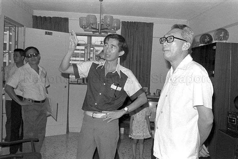 ▲刘太格(中)1979年与李光耀参观金文泰组屋。(图源:新加坡国家档案馆)