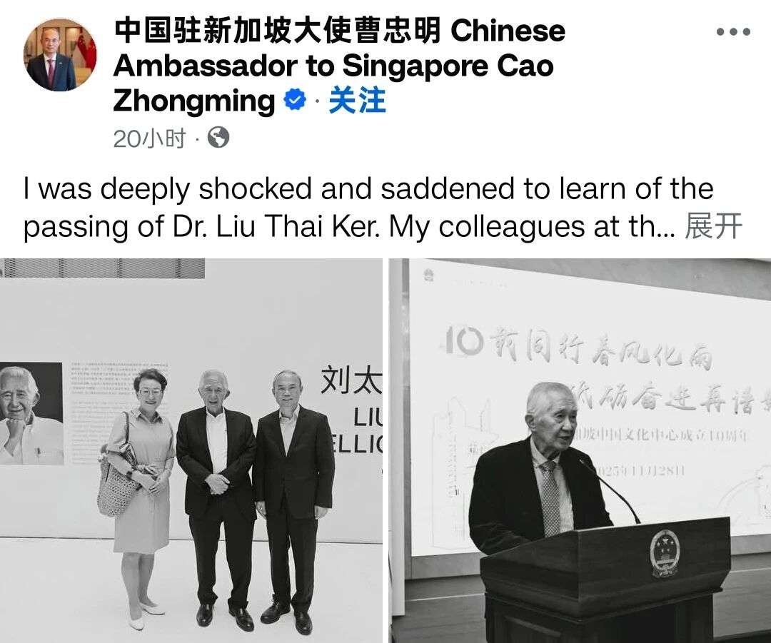 ▲中国驻新加坡大使曹忠明发文悼念刘太格。(图源:曹忠明大使社交媒体截图)