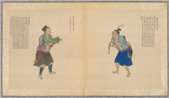 在这一官修民族图志中,中国境内的人物是按每族男女各一的规则来绘制,由地方总督、巡抚组织当地画家来画,图说则是由地方官员书写,之后由朝廷汇总。最后,乾隆派大臣对文字进行修订,由宫廷画师再度进行统一绘制。