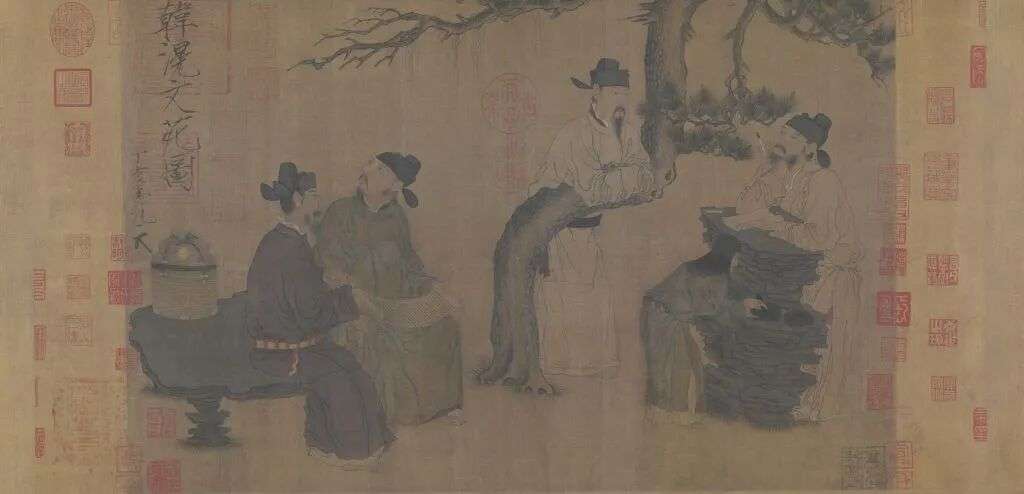 ▲《文苑图》,五代,周文矩,绢本设色,描绘中唐时文人钱起、刘长卿等在琉璃堂宴集吟诗作文的场面,表现了当时文人生活场景。来源/故宫博物院