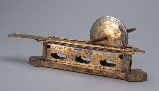 ▲唐鎏金鸿雁流云纹茶碾子,1987年出土于陕西宝鸡法门寺地宫。唐人吃茶先用茶碾将茶叶碾碎,然后将茶末冲饮。该茶碾通高7.1厘米,长27.4厘米,槽深3.4厘米;辖板长20.7厘米,宽3厘米,重1.168千克,整体银制纹饰填金,彰显中晚唐时上层生活中的奢靡风气。来源/法门寺博物馆