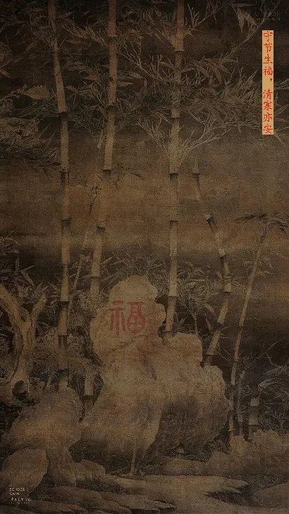 徐熙的《雪竹图》以寒竹写冬意,它写生感极强,却非照搬自然:竹竿比例、叶组结构与石面体块皆经取舍概括,因而逼真而耐读。雪竹题材屡被传写,正因其象征“君子之节”;石上“福”字如题刻嵌入,愿新岁守节生福、清寒亦安。