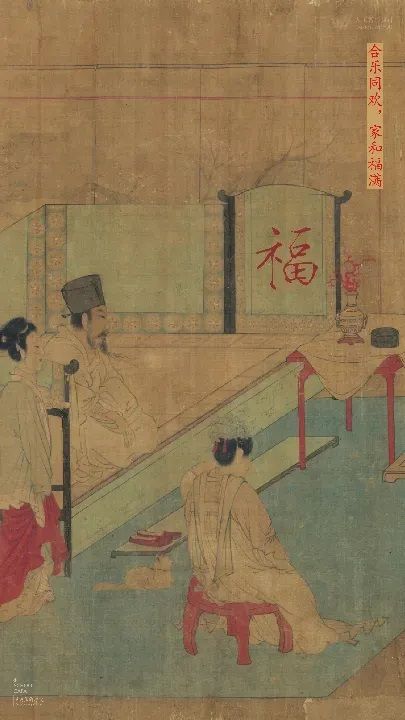 《合乐图》为南唐周文矩人物画名品之一,此段以工笔线描配设色呈现宫廷日常,坐具、几案、屏风与器物以清晰的边界与层层铺色组织空间,屏风上的“福”字与陈设同构:愿新岁合乐同欢,家和福满。