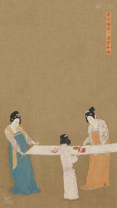 唐代张萱代表作《捣练图》以“捣练、展练”等工序入画,工笔细线勾勒人物衣褶与姿态,长幅白练横贯画面,形成最醒目的“视觉主轴”。绸面上的“福”字如把祝愿织进日常劳作,愿新岁寿安福厚,阖家和顺。