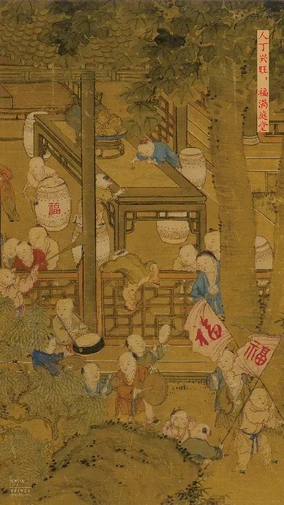 《百子图》局部以庭院为舞台,栏杆、桌案与廊柱之间,孩童们有的奔跑,有的回望,有的嬉戏;细笔勾勒使人物与器物清晰可读,繁密而有序。愿新岁人丁兴旺,福满庭堂。
