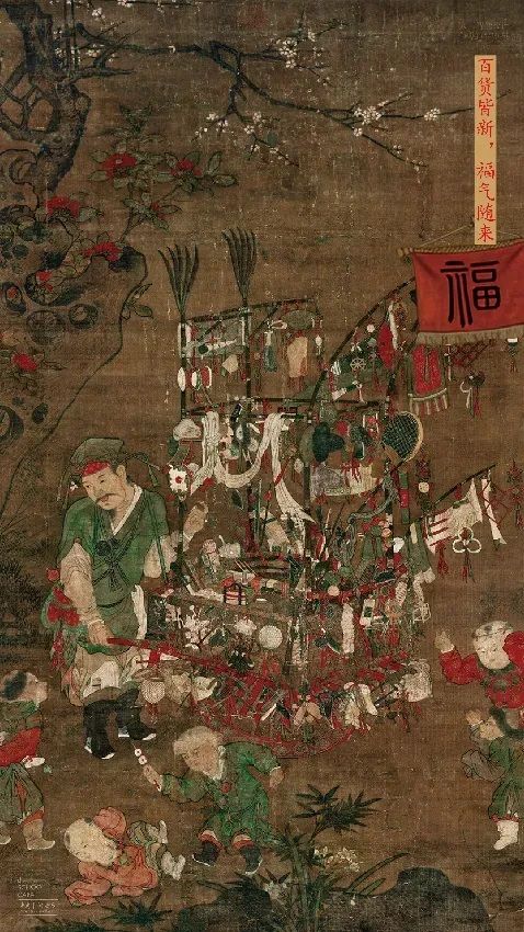 《货郎图》以市井“货郎担”描绘宋代风俗,满架小物,琳琅满目;孩童们围拢追逐,姿态各异;“福”字被置于货架最高处,像一声招呼:愿新岁百货皆新,福气随来。