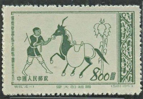 第一枚邮票图案选用了徐悲鸿1953年创作的《奔马》。这幅画创作于昔日内城东南处、临近内城东南角楼的徐悲鸿寓所。画作完成后,徐悲鸿题诗曰:“山河百战归民主,铲除崎岖大道平。”
