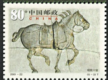 2001年10月发行的《昭陵六骏》特种邮票,全套6枚,图案分别展示了什伐赤、青骓、特勤骠、飒露紫、拳毛騧和白蹄乌这六匹唐太宗的座驾形象。这六骏原本陈列于唐太宗昭陵的北阙,是刻在六块青石上的浮雕。如今,四骏的原石收藏于西安碑林博物馆,剩余两骏(飒露紫与拳毛騧)则存于美国宾夕法尼亚大学博物馆。由于盗卖者的严重破坏,这六骏已伤痕累累。该套特种邮票采用原物真实再现的手法,未对历史损伤痕迹进行修饰。