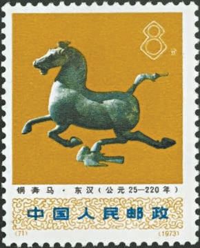 上世纪70年代,一批新出土的文物作为“友好使者”出国展示。为此,邮电部门发行了一组12枚的《出土文物》邮票,其中便包含著名的“铜奔马”。这件文物出土于甘肃武威一座东汉墓,如今收藏于甘肃省博物馆,是该馆的镇馆之宝。