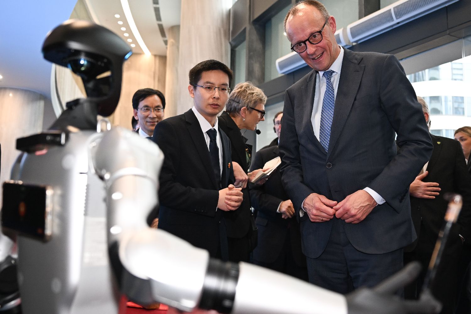 ▲2月26日,德国总理默茨在浙江杭州参访中国机器人企业宇树科技。(图片来自中新社)