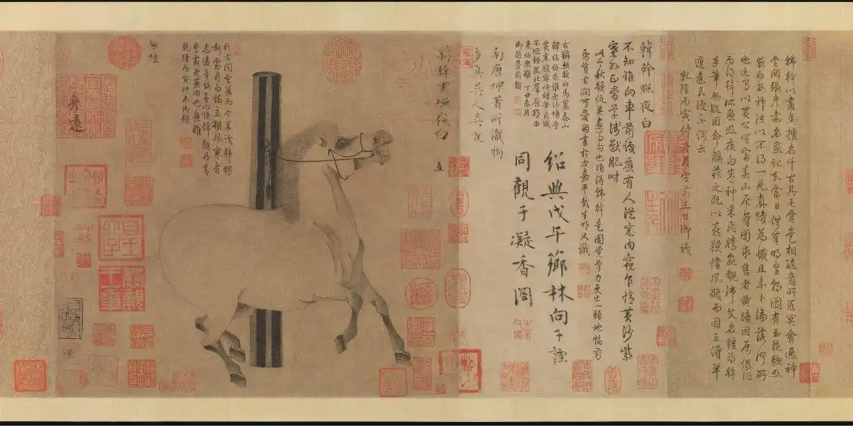 韩干的代表作《照夜白图》,系纸本水墨画,现藏于美国大都会艺术博物馆。该画构图极具张力,马被系于柱,却昂首嘶鸣,蹄欲腾跃,缰绳曲张似将崩断。一动一静、约束与挣扎之间的巧妙安排,凸显了不屈精神,构成强烈的视觉戏剧性。韩干的马不仅“穷殊相”,更于形似之外传达出马的“精气神”,那种高贵、激昂与顽强的生命意志,成为唐代马画中融“形神兼备”“气象雄浑”于一体的典范。