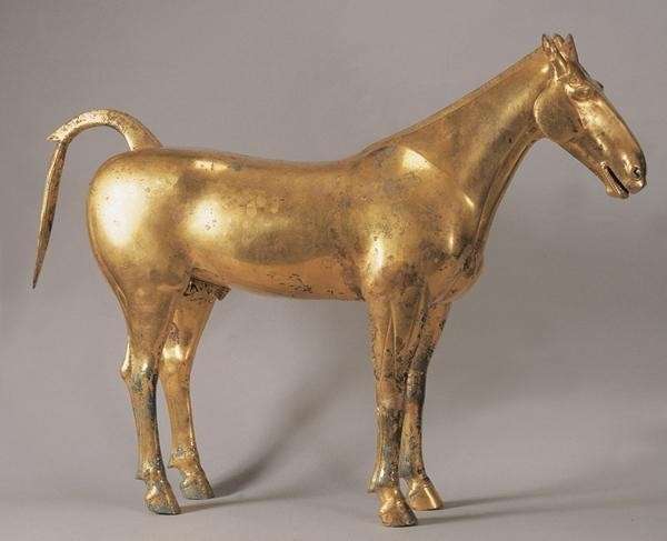 学术界普遍认为,西域马种的引进,使中原马的质量大为提高。陕西茂陵无名冢从葬坑出土的鎏金青铜马,应该就是以西域宝马为原型塑造的。铜马体长75厘米、体高62厘米,四肢直立,颈长而弯曲,小头,双耳如批竹,胸肌劲健,四肢修长,臀尻圆壮,马尾结扎下垂,外貌英俊。