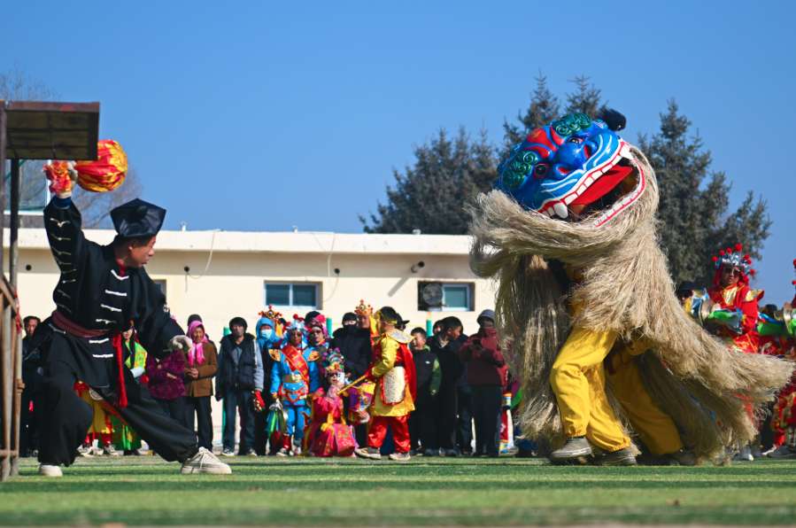 ▲2月3日,甘肃省榆中县马坡乡上庄村,村民进行青毛狮子舞狮表演。(图片来自中新社)