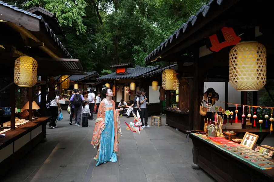 ▲2025年10月2日,四川成都,游客身着古装在杜甫草堂“广厦十二间”手工艺文创市集参观。(图片来自中新社)
