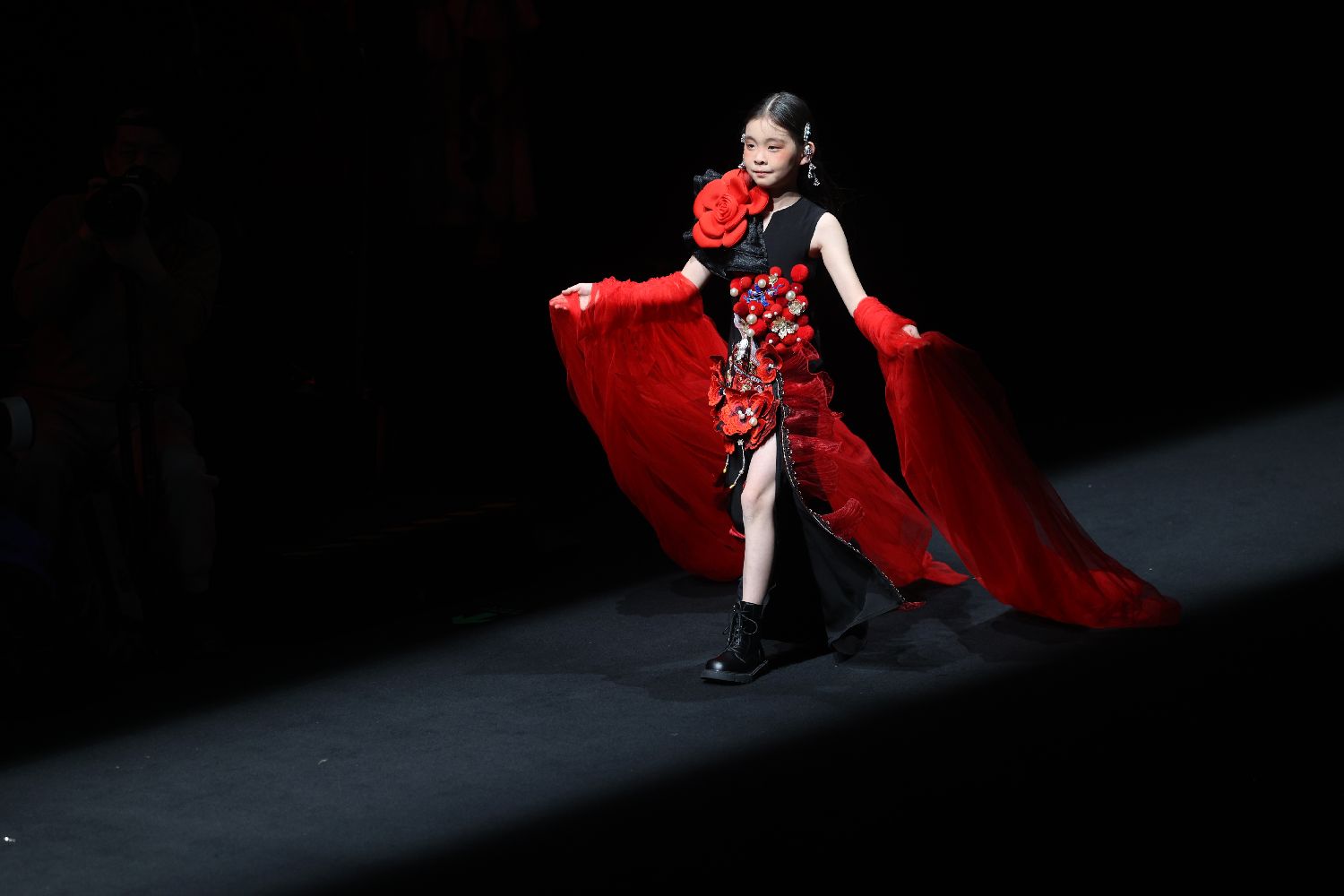 中国国际时装周期间,来自楚雄的彝绣服饰亮相北京舞台,设计师李蕊吟以孩童为主角展开呈现。云南楚雄彝绣作为拥有1800余年传承历史的国家级非物质文化遗产,在当代语境中焕发新意。小模特们身着色彩斑斓的服饰步入秀场,银饰轻响、纹样流动,在稚嫩与自信之间,传统非遗呈现出更为轻盈鲜活的一面。本系列以“彩”为主题,将山野气息与都市审美相融合,让民族文化在童真的表达中回归纯粹,同时绽放出时尚光彩。 图为2026年3月21日,小模特们行走T台,展示服装整体效果。李国庆摄
