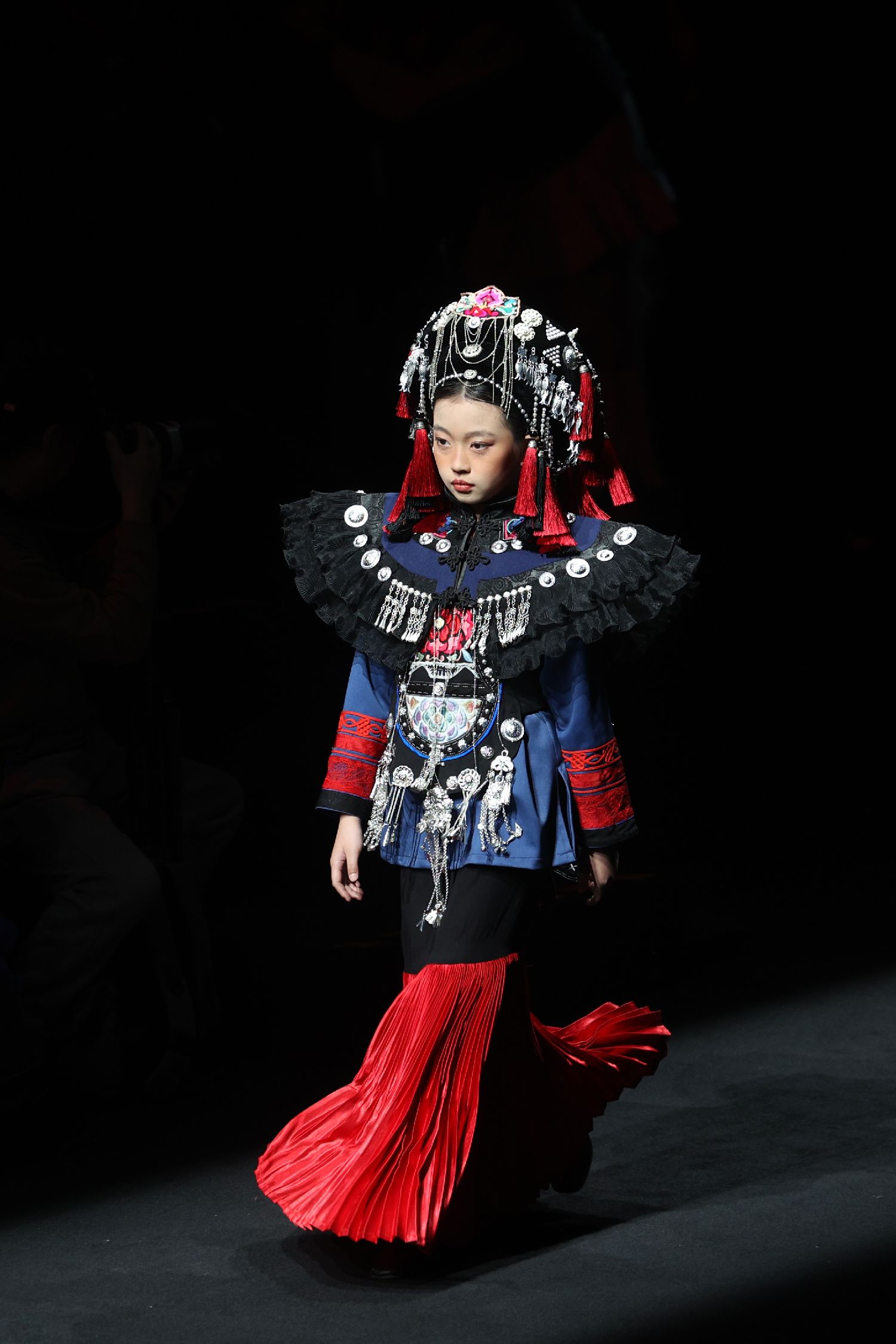 3月21日,小模特身着彝绣服饰,演绎彝族传统纹样与现代剪裁交融的时尚表达。李国庆摄