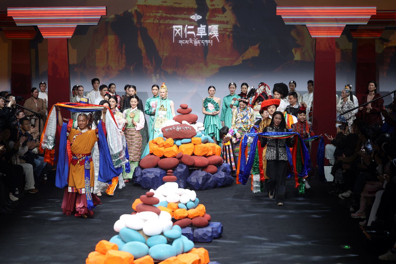 2026年3月26日,“冈仁卓嘎”携雪域非遗亮相中国国际时装周春季秀场。本季以国家级非遗堆绣、邦典、氆氇织造为核心,不做复刻,只让非遗艺术“自在生长”。材质上,牦牛绒的粗粝与丝绒的柔软并存,高原原生面料以现代廓形重塑,民族底色与国际视野在此交融。朝圣、雪域高原、绿度母三大系列依次展开,从仪式感的日常穿着到轻盈贴合的当代表达,别具特色的高原文明以最舒展的姿态走上了T台。 图为3月26日,模特及演职人员一起为现场观众献上哈达。李国庆摄
