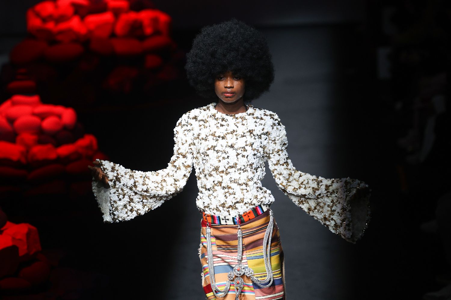 3月26日,一位外籍模特身穿大秀服饰走秀。李国庆摄