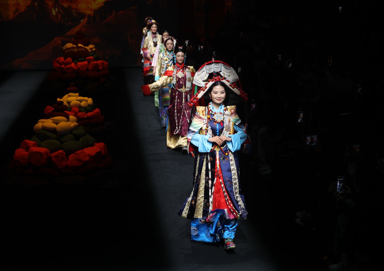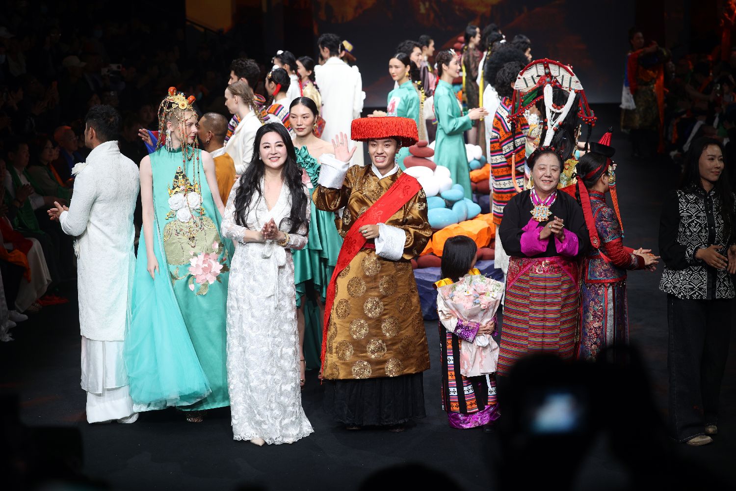 3月26日,“冈仁卓嘎”高定主理人、设计师郭蓉蓉(前左一)携模特们一起谢幕。李国庆摄