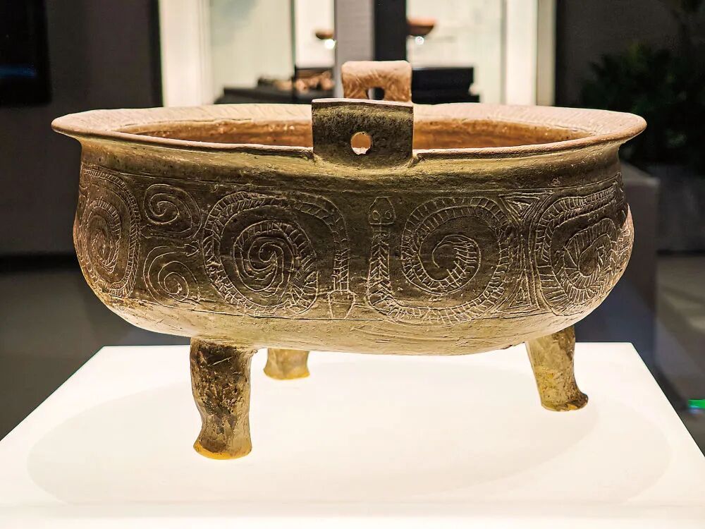 ▲“有瓷之初”展上的原始瓷三足蛇纹鼎。(图片来自新华每日电讯)