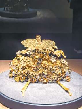 经过长期的研究,李静训墓中出土的金银器,如金项链与金手镯形制可能来源于中亚地区。闹蛾金钗上花枝乱颤的步摇装饰,同样起源于国外。唐代南北融合,中外交流,让金银器工艺达到巅峰,实为承袭前代,有着深厚的历史积淀。近20年来,扬州发现了隋炀帝与萧皇后墓,出土的萧后冠同样经历了文物工作者的精心复原。西安市唐代李倕墓出土的“金花冠”,拥有380多个小部件,几乎使用了当时的所有装饰材料,同样值得我们进一步的关注和探究。(完)(原标题:闹蛾春戏 千载重现)