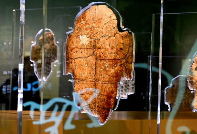 ▲河南安阳殷墟博物馆新馆内展出的刻辞卜甲(图片来源:新华社记者李安摄)