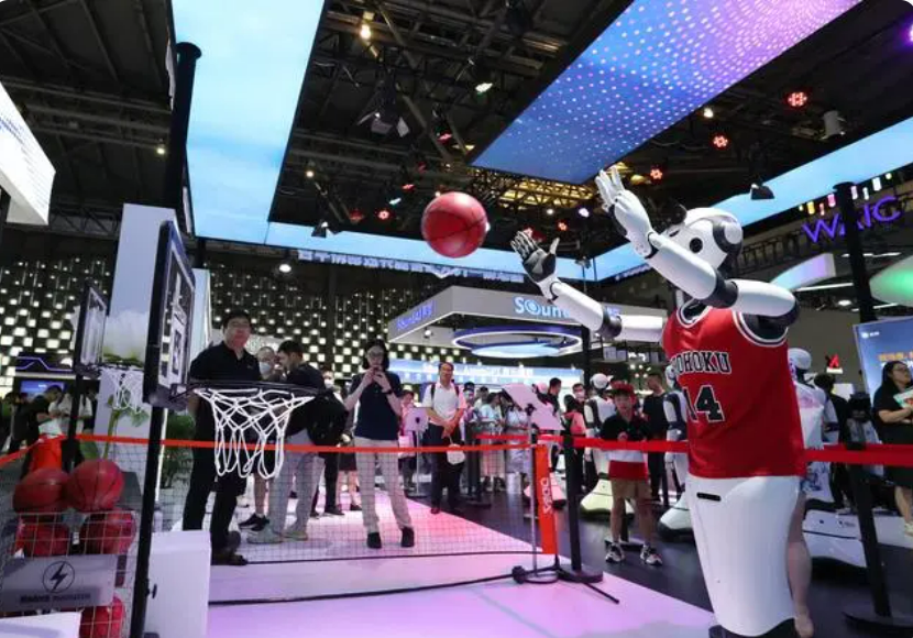 ▲7月6日,一个机器人在2023世界人工智能大会展会现场进行投篮表演。(图片来自新华社)
