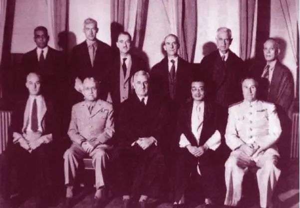 ▲1946年,梅汝璈(前排右二)与其他10名法官在远东国际法庭合影照片。(中新网资料图片)