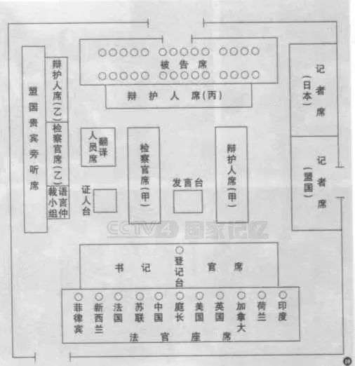 ▲审判战犯时,远东国际军事法庭的内部结构。(视频截图)