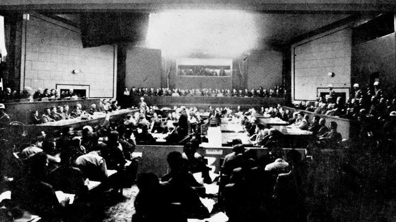 ▲东京审判现场,战犯在被告席等待审批。(中新网资料图片)