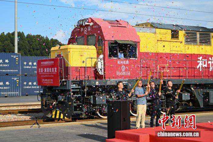 ▲2024年10月14日,首趟满载老挝进口香蕉的中老铁路“京滇•澜湄线”国际货运列车从云南省昆明市王家营西站驶出,标志着中老铁路国际冷链班列暨“京滇•澜湄线”国际货运列车正式开行。中新社记者李嘉娴摄