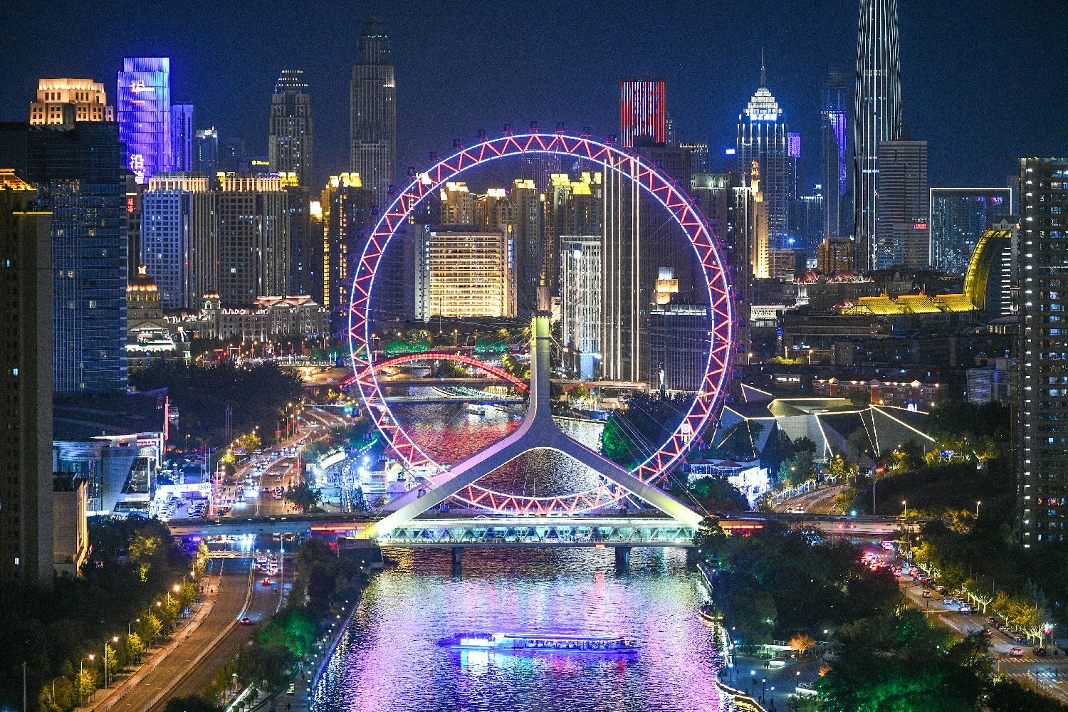 ▲上合组织峰会将于8月31日至9月1日在天津举办。图为天津地标之一的“天津之眼”摩天轮夜景。(中新社资料图片)