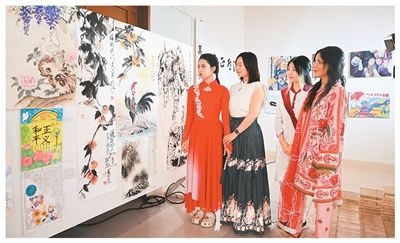 ▲中巴教育文化中心学生刘惠君(左一)向巴基斯坦朋友介绍自己的画展作品。(中巴教育文化中心供《人民日报海外版》)
