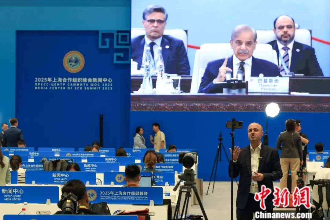 ▲2025年9月1日,天津,外国记者在2025年上海合作组织峰会新闻中心进行直播。中新社记者 佟郁 摄