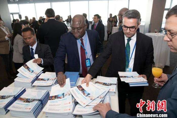 ▲当地时间2023年4月19日,“全球发展倡议新进展可持续发展议程新行动”主题展览在纽约联合国总部举行。图为与会嘉宾取阅国合署发布的新报告——《国际发展合作的中国实践》。中新社记者 廖攀 摄