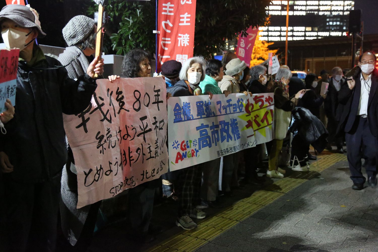 “高市下台”“立即撤回错误言论”“不要将国民卷入战争”“金权、军扩,强横的高市政权十分糟糕”……25日晚,数百名日本民众在首相官邸前手持标语、高呼口号,对日本首相高市早苗近期错误言行表达强烈不满,要求高市辞去首相职务。
